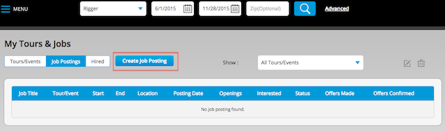 Note: If you need multiple crew for a single Tour/Event, you must create separate Job Postings for each crew position. Once the first Tour/Event posting has been created, simply select the Tour/Event name from the drop down list on your next job posting to link the separate crew positions under a Tour.